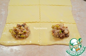 Заранее размороженное тесто немного раскатать и разделить на 12 квадратов. Посередине каждого положить начинку.