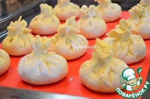 Смазать мешочки взбитым желтком с молоком. Выпекать в заранее разогретой до 210 градусов духовке 20-25 минут до золотистого цвета. Когда вы будете ставить мешочки в духовку, возьмите пульверизатор с водой и хорошо обрызгайте стенки и дно духовки, тогда слоеное тесто будет более легким и воздушным.
