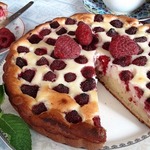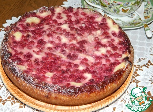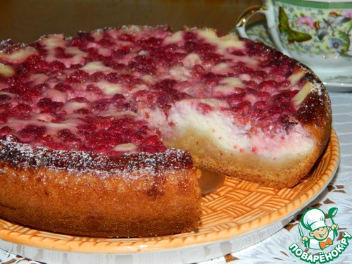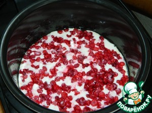 На слой теста распределяем творожный слой и выкладываем малину. Если мороженая, то её разморозить и сок слить. Выпекать на режиме "Выпечка" 100минут. Готовый пирог остудить в чаше.