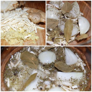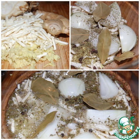 • Коренья вымыть, очистить и мелко нарезать. Луковицу очистить, разрезать на 4 части. В большой стеклянной посуде смешать нарезанные овощи с чебрецом, сидром, лавровым листом и горошинами черного перца.