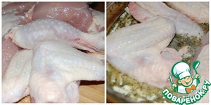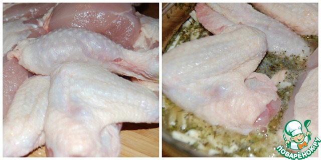 • Курицу вымыть, обсушить и разрезать на кусочки. Положить в миску с маринадом, перемешать, накрыть пищевой плёнкой и убрать в холодильник минимум на 4 часа.