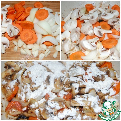 • Морковь, чеснок, оставшийся лук очистить и крупно нарезать. Шампиньоны промыть и разрезать на 4 части. Обжарить овощи и грибы на сковороде, посолить, поперчить. Присыпать все мукой, слегка спассеровать.