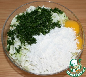 Добавить мелко нарезанную зелень укропа, яйца, соль и муку.