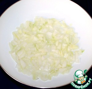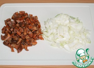 Приготовить начинку для пирога. Грибы мелко нарезать (у меня были рыжики, предварительно отваренные), лук очистить и мелко нарезать.