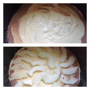 Закрываем начинку остатки теста, ложкой разравниваем, но не усердствуем. Тесто очень нежное. Сверху выкладываем дольки очищенного яблока, не придавливаем. Ставим режим выпечка 60 мин. Полностью даем пирогу остыть и вынимаем. Украшаем по своему усмотрению.