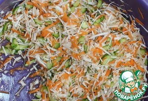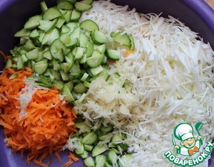 Готовим, начинку,-капусту мелко шинкуем. Морковь натираем на крупной тёрке. Огурцы (я беру маленькие)полу-кружк ами. Чеснок либо натираем на тёрке, либо мелко режем.