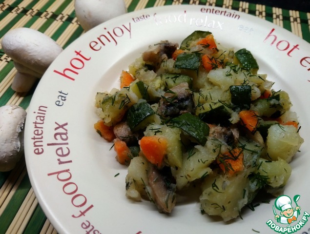 Ингредиенты - картофель, цуккини, морковь, помидор, лук и подсолнечное масло.
