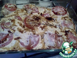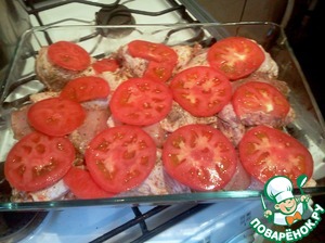 Нарезаем тоненько кружочками помидор и выкладываем на довольную, после массажа курочку...