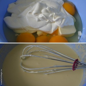 Яйца, сметану, масло (очень мягкое) хорошо взбить венчиком до однородного состояния.