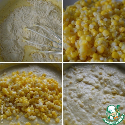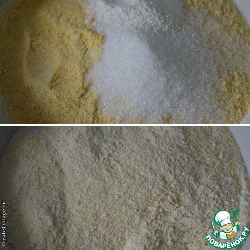 В отдельной посуде смешиваем сухие компоненты — пшеничную и кукурузную муку, сахар, соль, разрыхлитель.