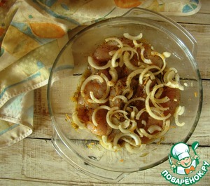 Маринуем куриную грудку: замачиваем кусочки в соке 0,5 апельсина, добавляем зубчик чеснока и корень имбиря, натертые на мелкой терке, соль, перец и лук полукольцами. Можете добавить на этом этапе любимую приправу дополнительно. Оставляем на 15 минут.