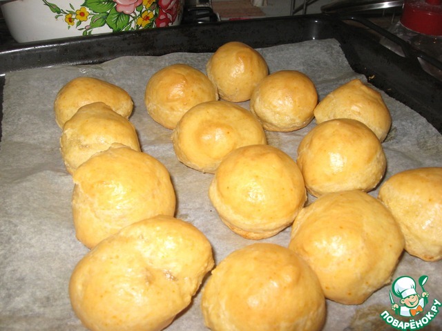 Включить духовку на 200 гр, в кастрюлю налить 100 мл воды, добавить 25 г масла, щепотку соли, довести до кипения, добавить муку, быстро перемешать. и убрать с огня.
