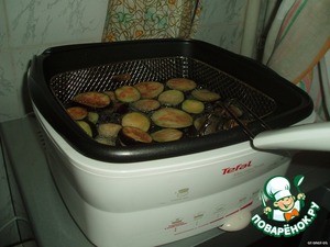 • Тем временем баклажаны уже готовы, закрепить сетку с баклажанами в фритюрнице, чтобы стекло излишнее масло.