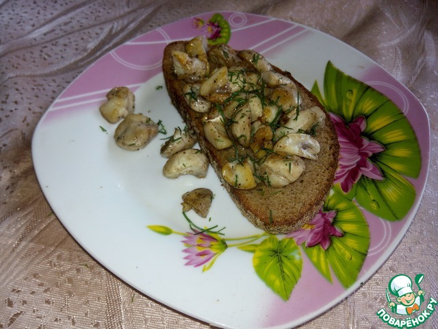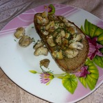 На каждый тост выложить щедрую порцию грибов. Украсить петрушкой и дольками лимона.