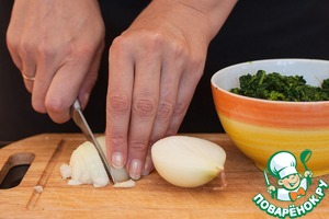 Лук мелко нарубить. Шпинат разморозить, лишнюю воду отжать и мелко нарезать.