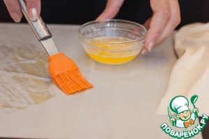 5 листов теста фило разрезать на 2 равные части. Получится 10 листов, 9 из которых отложить под слегка влажное полотенце, чтобы не пересыхали, а десятый лист смазать растопленным сливочным маслом