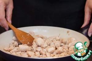 Разогреть в сковороде немного растительного масла и на сильном огне обжарить кусочки курицы вместе с маринадом до полуготовности - снаружи мясо побелеет, а внутри останется розовым. Остудить