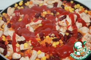 После чего с фасоли и кукурузы сливаем жидкость. Я еще немного промыла фасоль под холодной водой. И добавляем в нашу сковороду.
