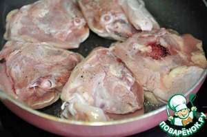 Наливаем на сковороду масло, нагреваем на максимальном огне, кладём бёдра кожей вниз. Обжариваем, не закрывая крышки, до румяности (около 7-8 минут). -