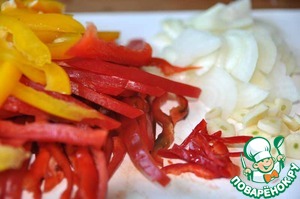 Овощи моем, чистим. Перцы нарезаем тонкими полосками, лук полукольцами, чеснок пластинками.