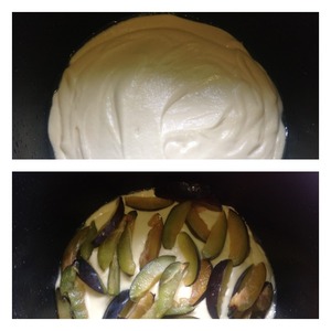 Чашу МВ смазать растительным маслом и вылить половину теста. Выложить сливы очищенные от косточки, и порезанные соломкой. Сверху сливы притрушить мускатным орехом