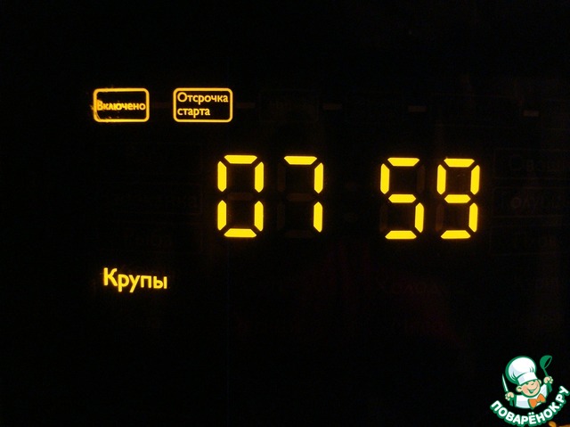 • Закрываем крышку, паровой клапан ставим в положение закрыто и устанавливаем режимы: меню скороварку - крупы на 59 мин, отсрочка старта на 8 часов и пуск. (Время отсрочки выбирайте сами, к какому часу вы хотите получить варёный горох. Я поставила в 24:00 и горох начал вариться в 7:00. В 8:00 горох был готов.)