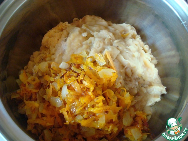 • Сваренный горох выкладываем в другую посуду (дабы не повредить защитный слой чаши), добавляем обжаренные овощи и взбиваем блендером