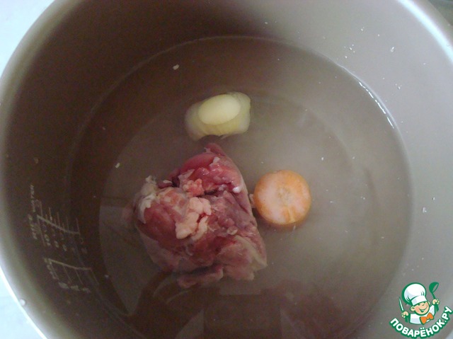 • Мясную косточку заливаем водой, кладём лук, морковь, солим и вставляем чашу в мультиварку