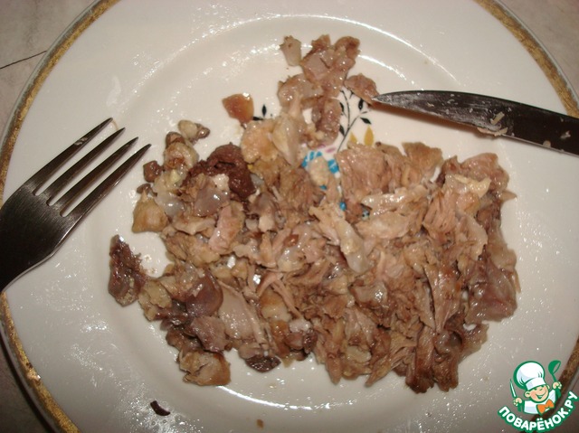 • Варёные овощи отдаём домашним животным, а мясо снимаем с кости и измельчаем. Убираем в холодильник до утра.