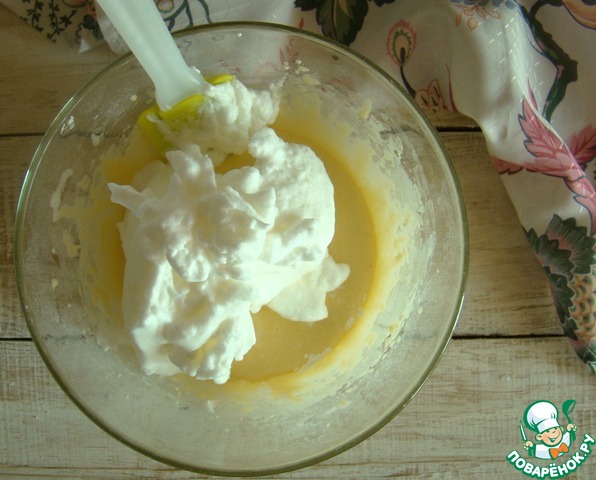 Белки достаем из холодильника и взбиваем до устойчивых пиков. Добавляем в наше тесто и аккуратно перемешиваем силиконовой лопаточкой по часовой стрелке от внешней стенки миски к середине, как бы укладывая конвертиком.