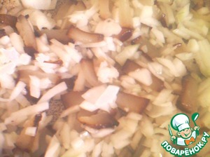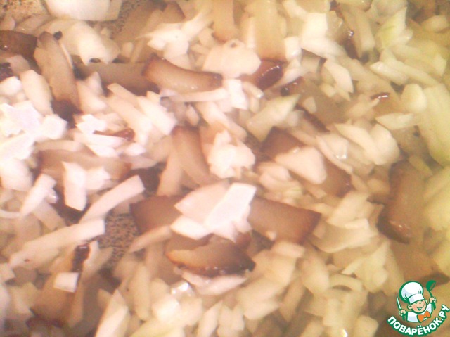 После прожарки сала с одной стороны добавляем нарезанный мелко лук и продолжаем жарить до прозрачности