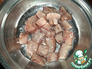 Пока каша остывает, займемся шашлычками. Филе рыбы нарезать кубиками, сбрызнуть соком лимона и посолить. Рыбу можно брать любую с плотной мякотью, у меня - скумбрия.