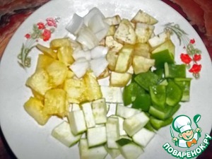 Овощи и ананас так же нарезать пропорциональными кубиками.