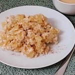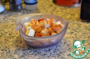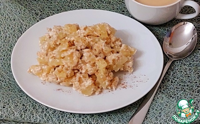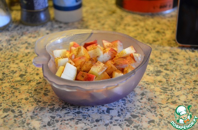 Нарезаем яблоко кубиками, посыпаем корицей, отправляем в микроволновку на 1 минуту