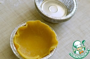 10. Формы, у меня одноразовые из фольги смазать сливочным маслом. Тесто разделить на 6 равных частей. Каждую часть в свою очередь разделить на 2 части одна больше другой. Большую часть раскатать, выстелить форму.