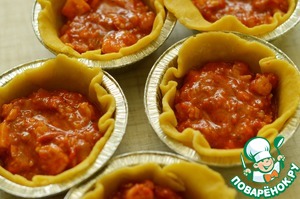 13. В сотейник, где тушился соус добавить ложку масла, кисточкой смешать масло с остатками соуса и смазать этой смесью верх пирога.