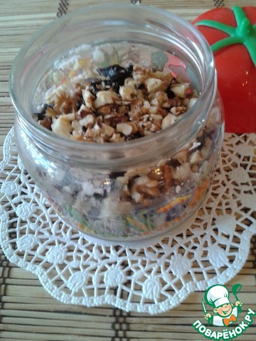 Поливаем этой массой яблоки, посыпаем сверху черно слив, орехи, отправляем в микроволновку на 2 минуты