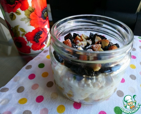 Смешиваем творог, молоко, мед, хлопья