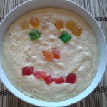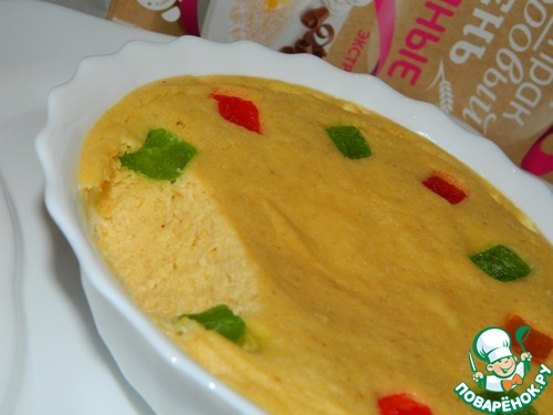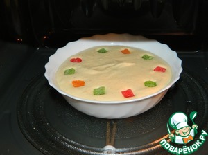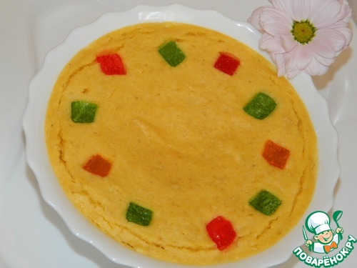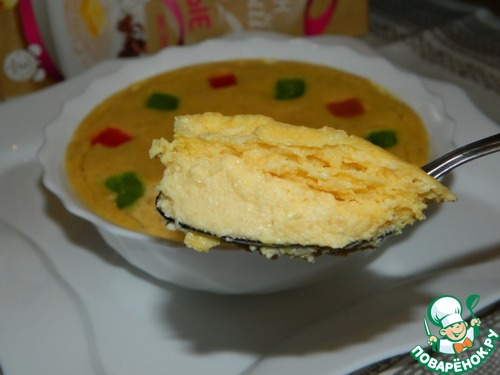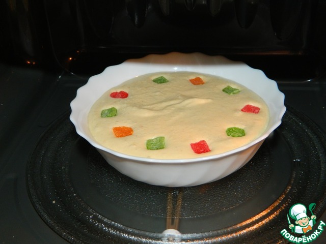Выкладываем в чашу пригодную для микроволновой печи. Добавляем по желанию, цукаты, изюм, курагу... В процессе запекания суфле будет немного подниматься - учтите это при выборе посуды.