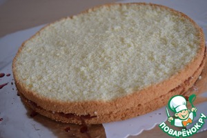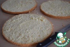 Разрезаем бисквит острым длинным ножом вдоль - на 3 части