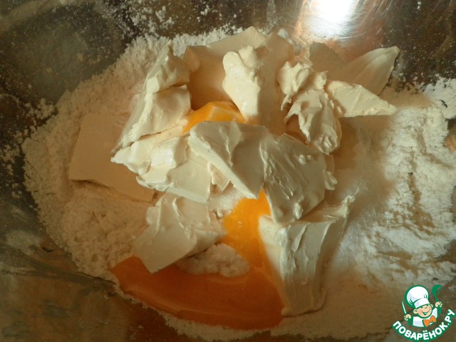 Добавить масло, сахар, яичный желток, сок лимона. Замешиваем пластичное тесто. Делаем шар, заворачиваем в пленку и убираем в холодильник на 30 мин.