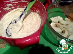 Добавляем по одному отделенные желтки. (белки убрать пока в холодильник). добавляем по тихонечку муку с разрыхлителем. Перемешиваем миксером на маленькой скорости. Чистим два яблока, режем тонко дольками, сбрызгиваем лимоном и убираем в миске пока сторону.