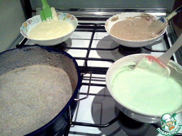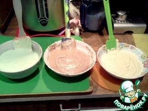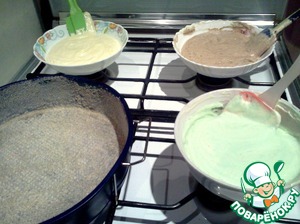 • Справились! Тесто -густенькое. Наливаем аккуратно, чтобы слои не перемешались.