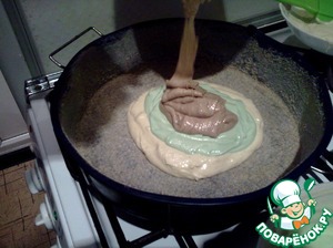 Небольшими порциями по паре ложек, наливаем в центр друг на друга, чередуя слои как вам понравится! Белый-синий-коричневый.