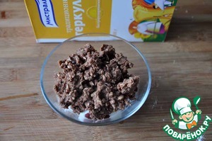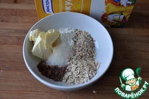 В миску кладём овсяные хлопья "Геркулес" от "Мистраль", сливочное масло, муку, сахар (1 ст. ложку), какао-порошок, дробленный миндаль.