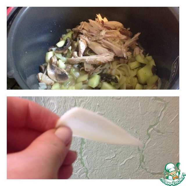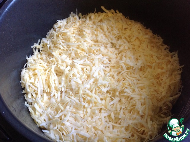 В чашу МВ выложить слой картофеля, немного подсолить и выложить начинку