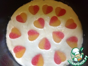 Готовое тесто выложить в чашу МВ смазанную растительным маслом, сверху выложить мармелад. У меня мармелад крупный и тяжелый, поэтому ушел на дно, если хотите этого избежать лучше взять мармеладные тонкие дольки.
