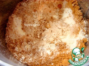 Отдельно смешать муку, какао - порошок, имбирь, мускатный орех, разрыхлитель, соду и просеять их.