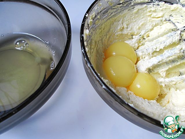 Сливочное масло комнатной температуры взбиваем с половиной сахара, добавляем три желтка.