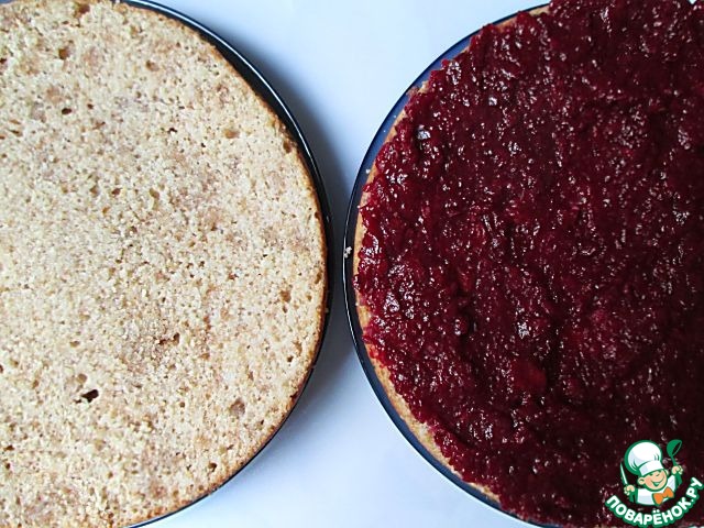 Разрезаем корж вдоль на две равные части, одну половину покрываем толстым слоем джема и аккуратно накрываем второй половиной. Украшаем пирог просеянной сахарной пудрой.